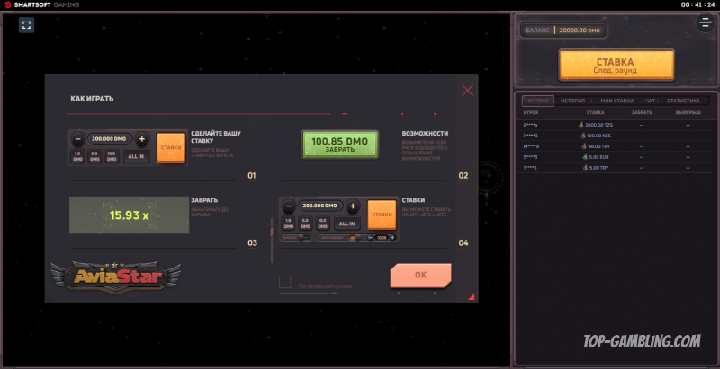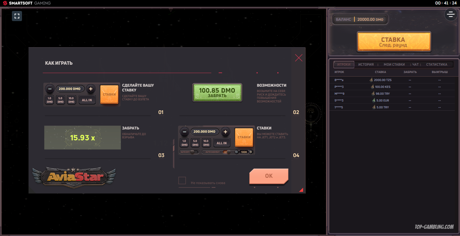 Avia Star – это азартная игра, в которой три футуристических корабля устремляются в космос, а игрокам предстоит решить, когда забрать выигрыш. Игра сочетает стратегию и удачу, предлагая игрокам возможность рискнуть и попытаться получить максимальный выигрыш, принимая решения в режиме реального времени.
