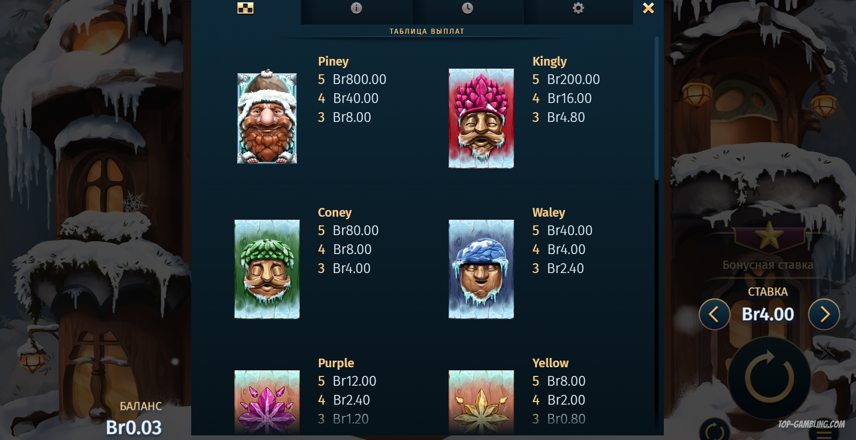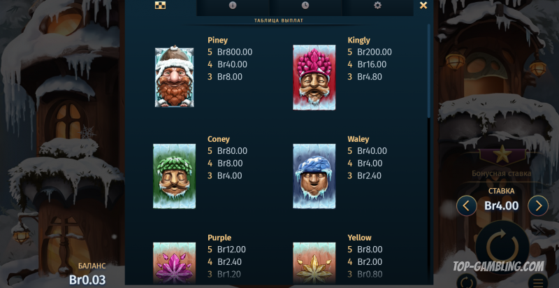 - Высокооплачиваемые символы: К числу премиальных символов относятся Piney, Kingly, Coney и Waley. Если на линии выпадет пять одинаковых изображений, можно получить выигрыш от 10x до 200x от ставки.
