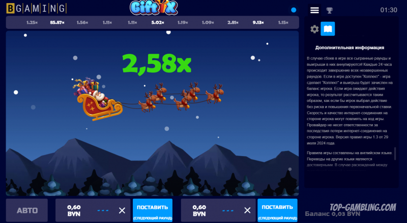 Игровая механика проста, но увлекательна: игрок должен нажать кнопку "Забрать выигрыш" до того, как сани Санты исчезнут с экрана. Тогда его ставка умножится на текущий множитель.