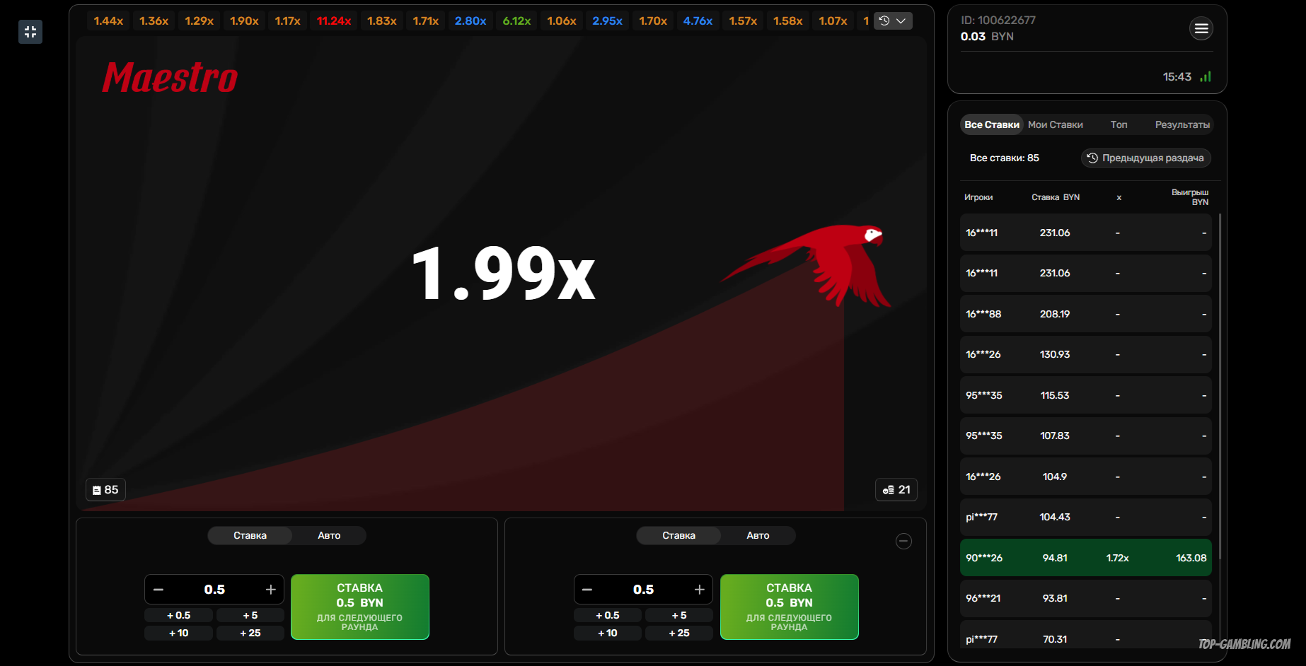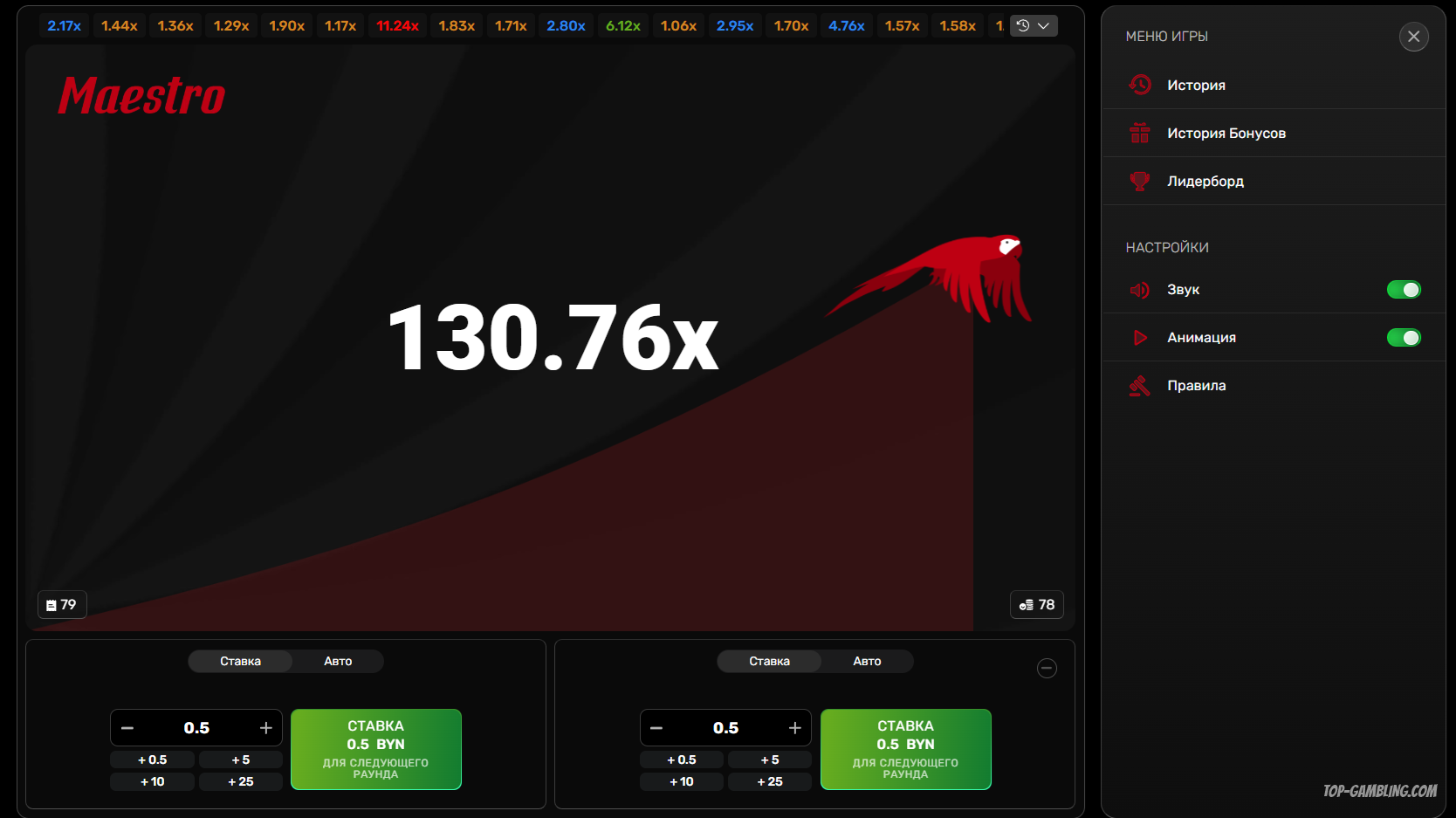На главном экране игры Maestro отображается таблица с результатом предыдущих раундов. В ней фиксируются коэффициенты, на которых завершились полеты попугая.