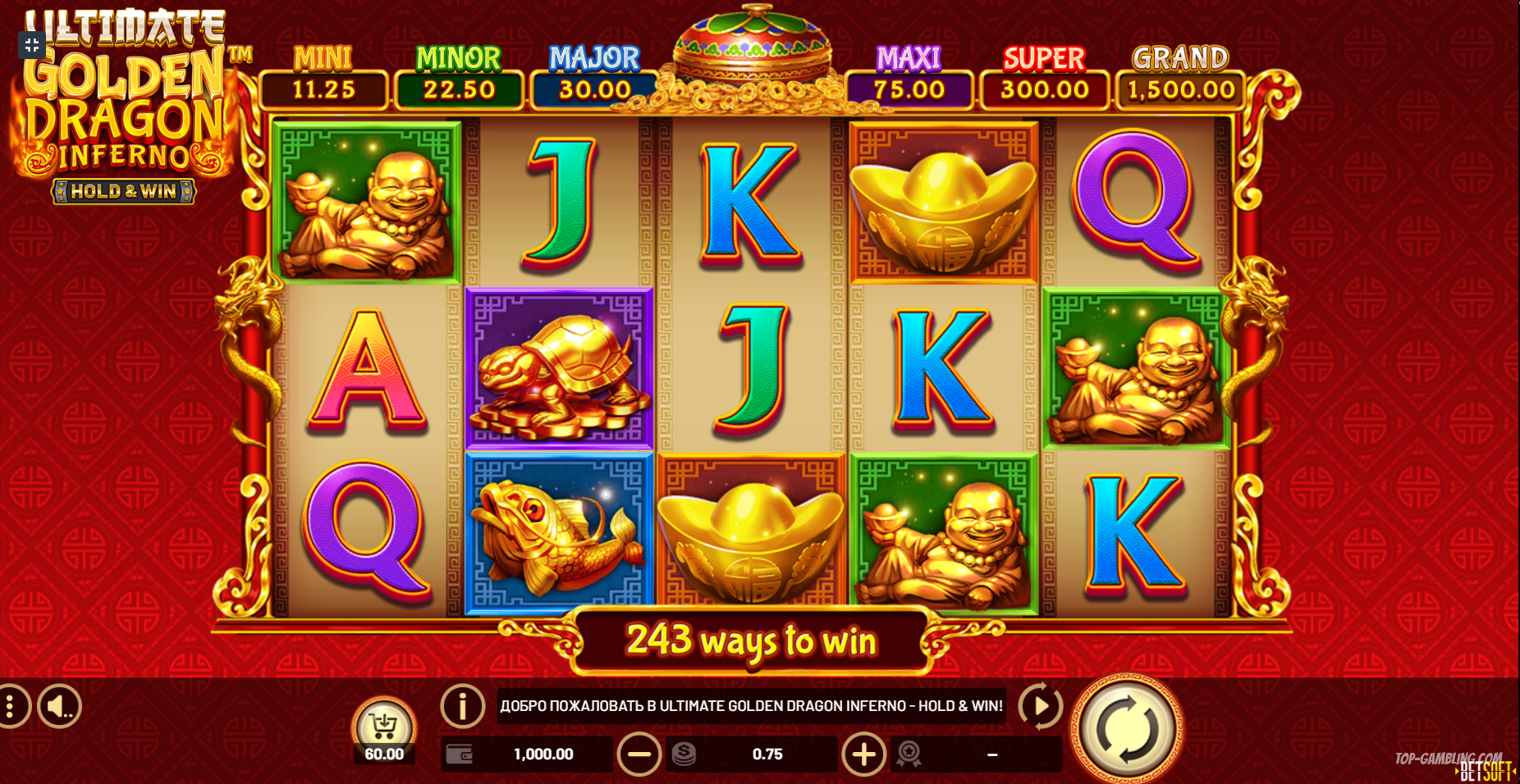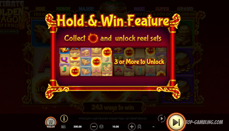 Ultimate Golden Dragon Inferno – Hold & Win – это захватывающий слот с уникальной механикой, сочетающей классические элементы азиатской тематики и инновационные бонусные функции.
