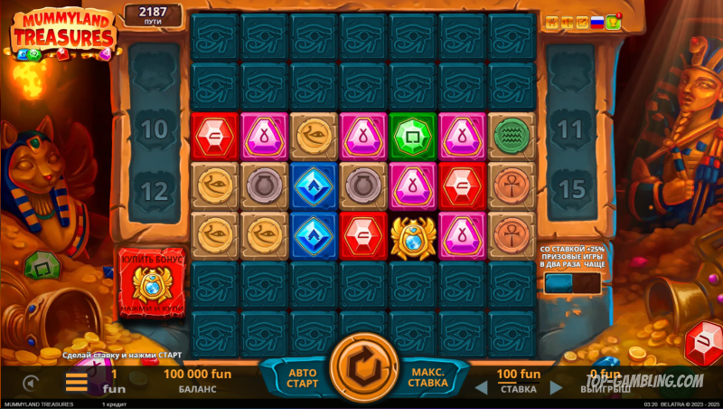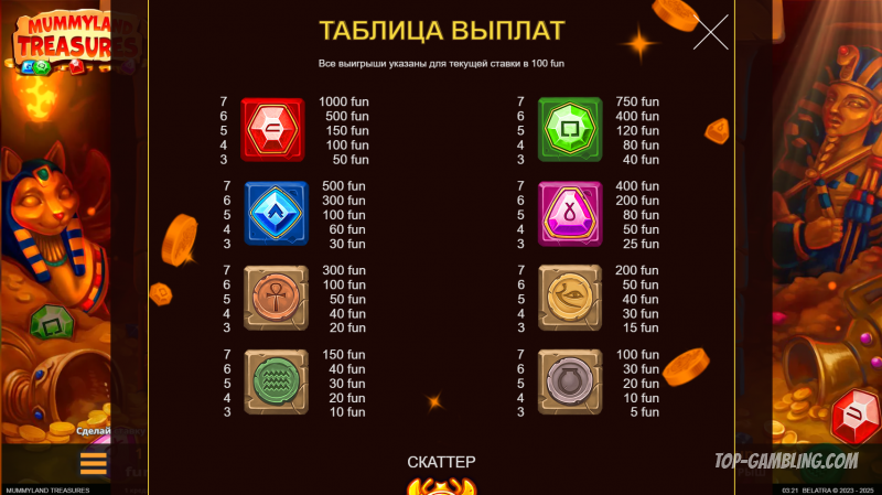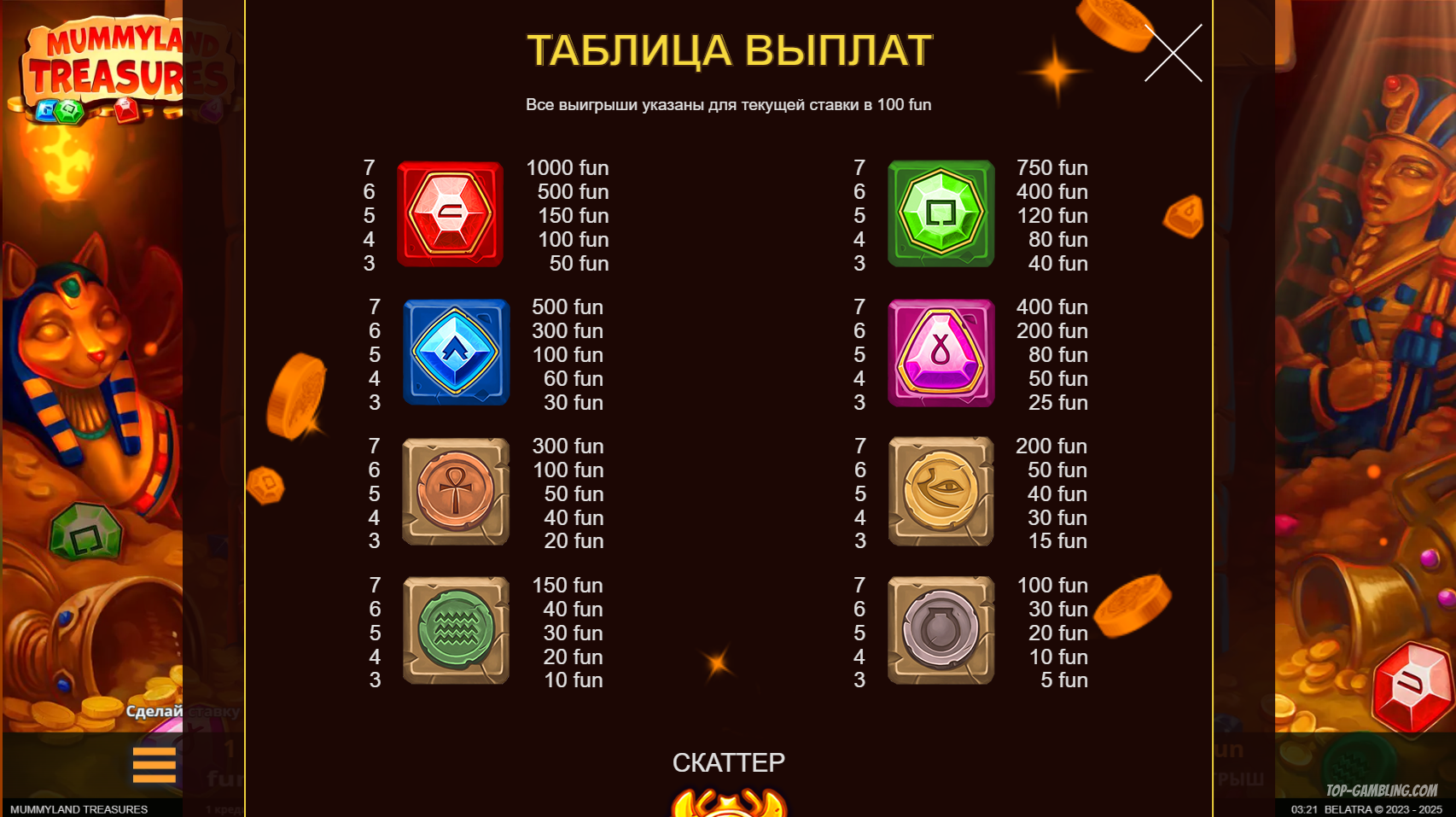 Слот Mummyland Treasures обладает динамичной механикой, поэтому такая резкая смена уровней ставок может активировать дополнительный цикл удачных комбинаций и бонусов.