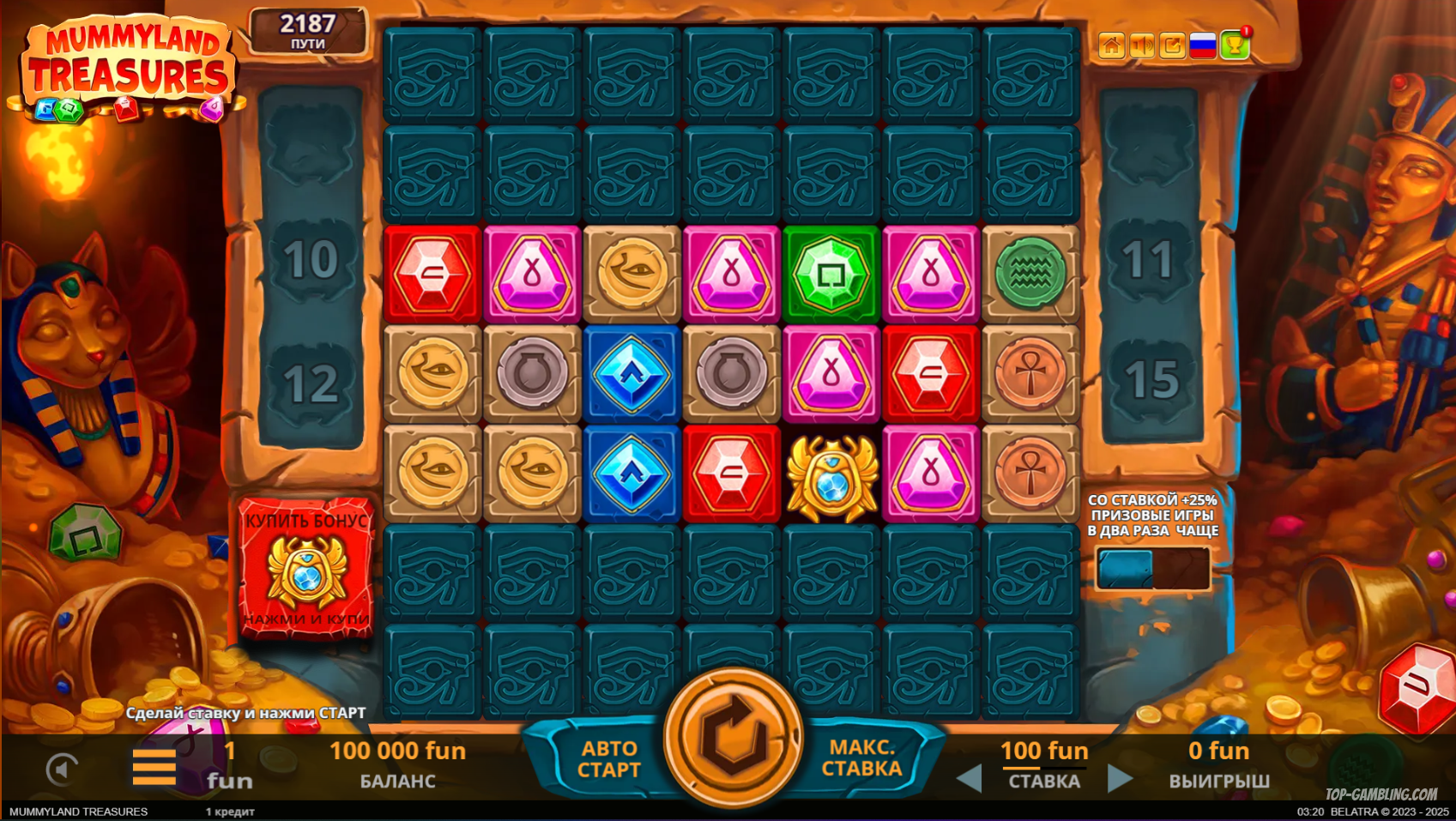 Периодически включай игру с максимальным количеством игровых линий, но используй минимальную ставку. В слоте Mummyland Treasures большое число активных линий увеличивает вероятность активации бонусных функций и частых комбинаций, пусть и небольшого размера. Делай серии по 20–25 спинов, после чего постепенно повышай ставку и возвращайся к стандартному уровню ставок.