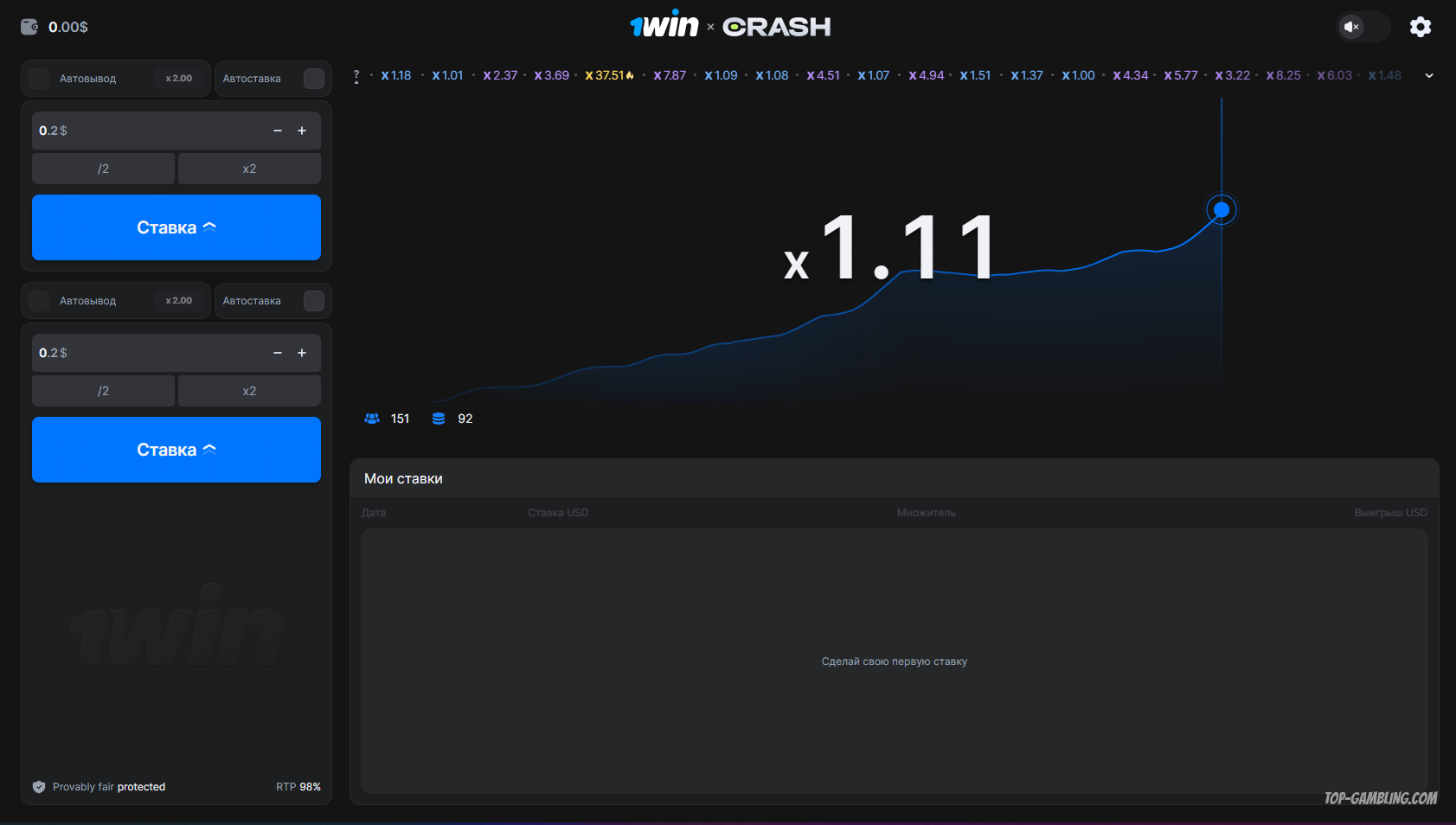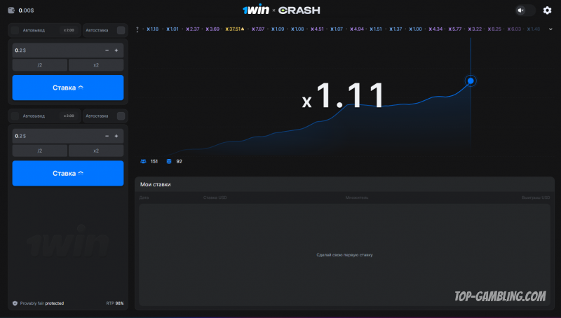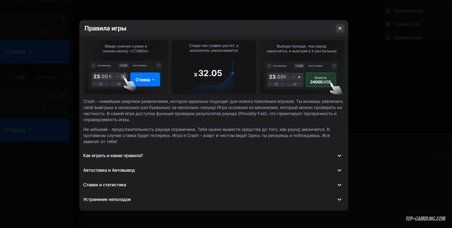 Crash — одна из самых популярных краш-игр, где игроки делают ставки и должны вывести деньги до обрушения коэффициента. Вроде бы все просто, но случайность и скорость делают игру динамичной и непредсказуемой.