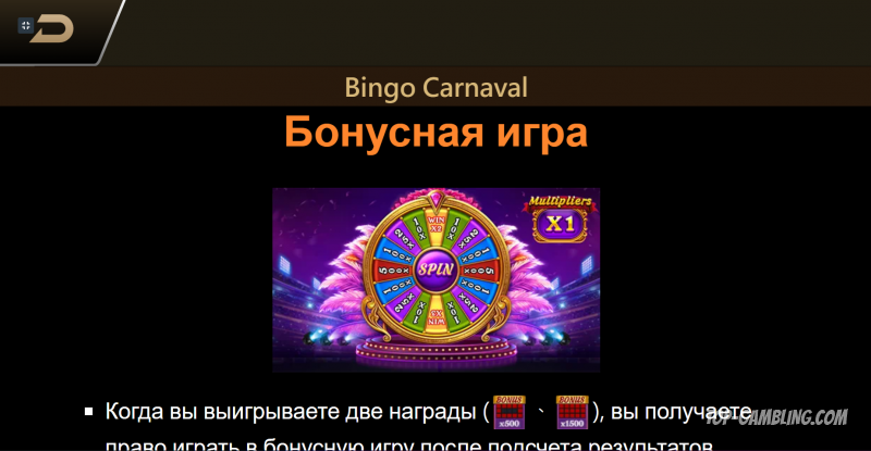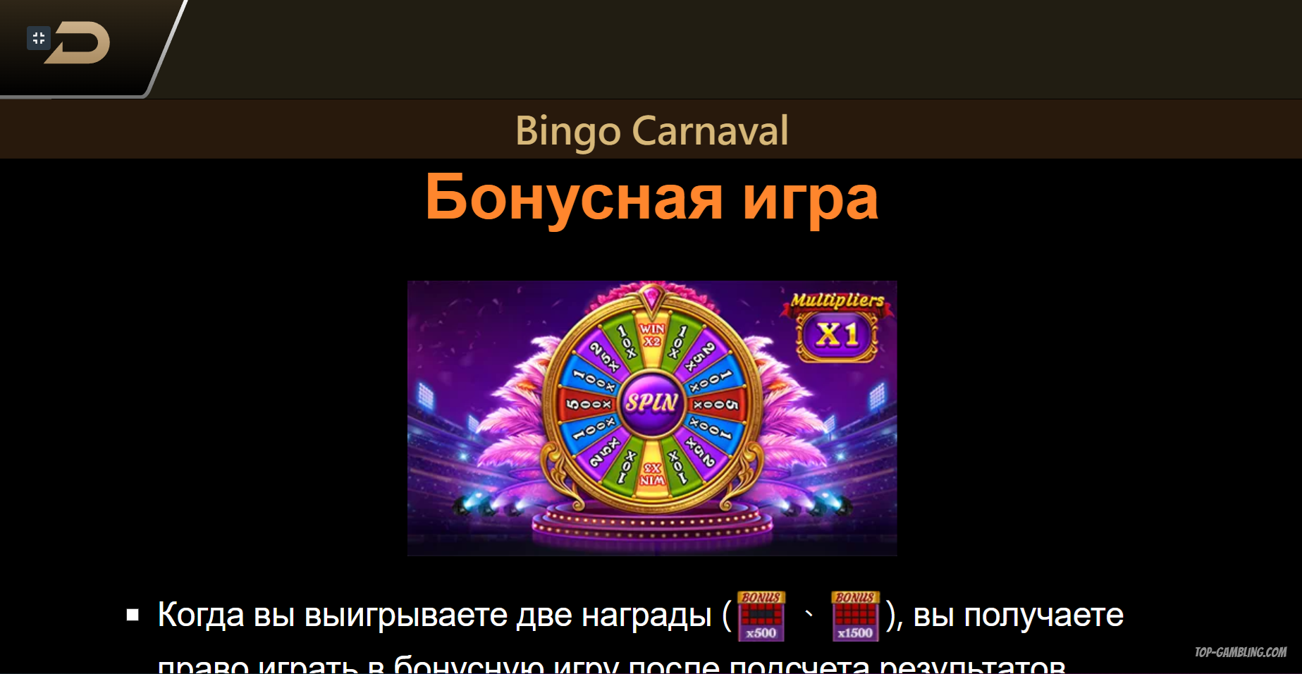 Здесь можно активировать до четырёх карт, настраивать ставки и запускать вращающееся колесо фортуны. Bingo Carnaval подойдёт тем, кто любит простые правила, азарт и шанс на крупный выигрыш.