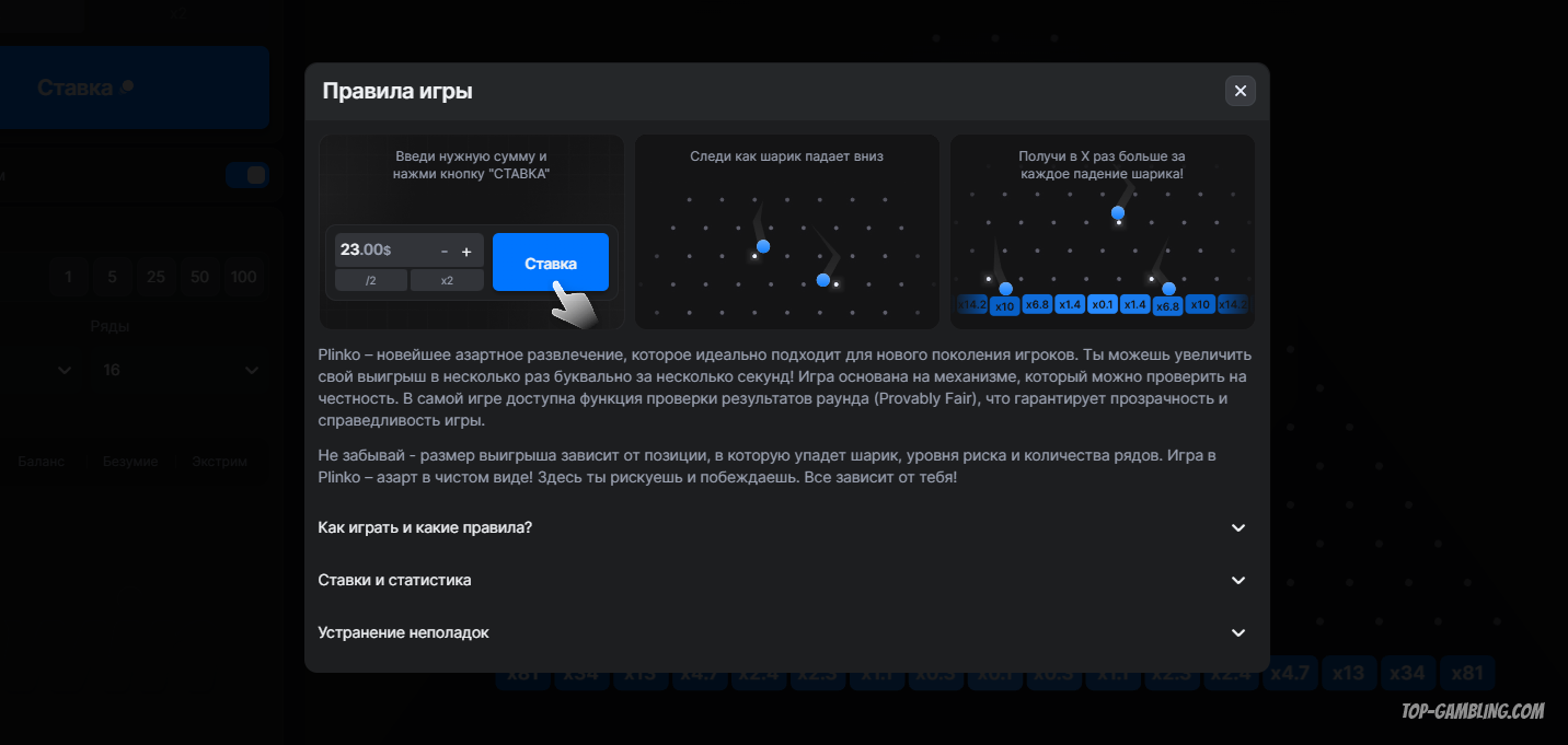 После нажатия кнопки «Ставка» шарик запускается с верхней точки доски и хаотично отскакивает от штырей, пока не достигнет низа. Там он попадает в одну из ячеек — именно она определяет выигрыш: ставка умножается на указанный множитель.