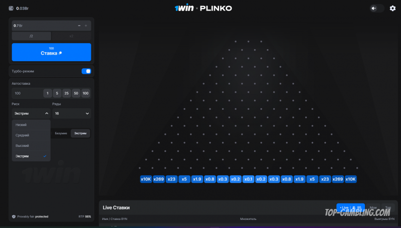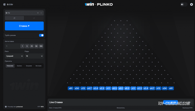 В центре — классическое поле с пинами, по которым шарик хаотично скатывается вниз, определяя итоговый множитель. А справа — лента Live-ставок, где можно наблюдать за успехами других игроков в реальном времени.