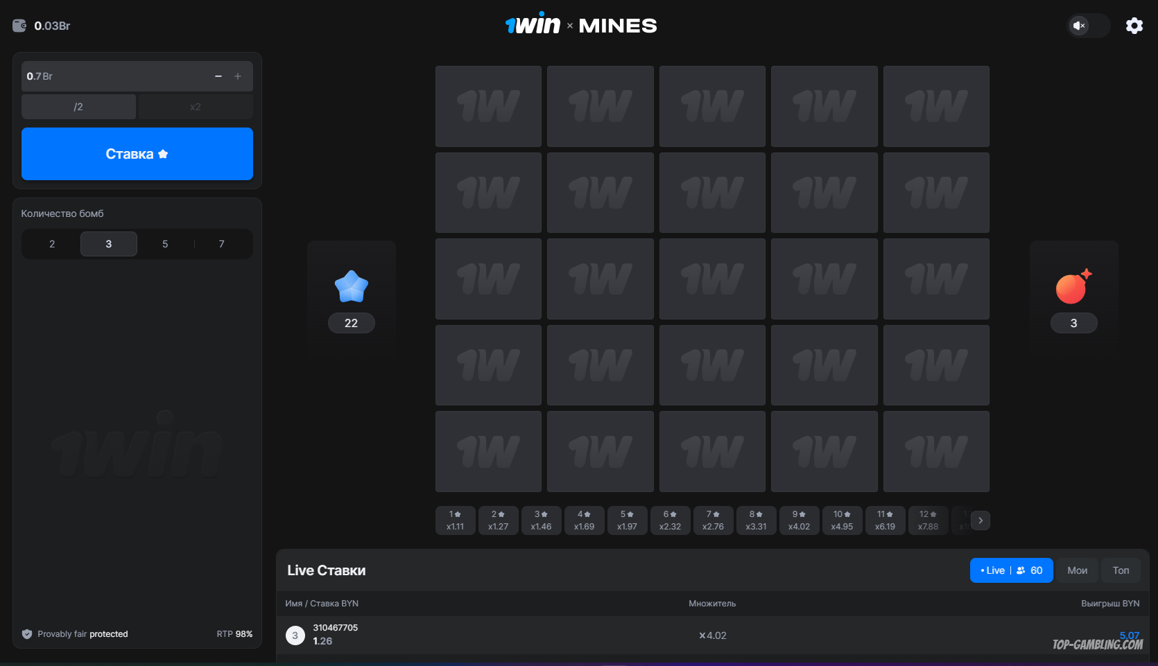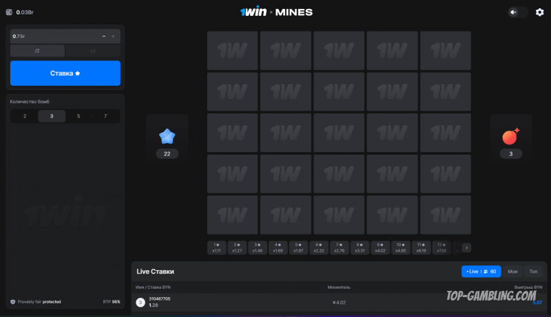 Для выбора предусмотрен отдельный блок в левой части экрана, где можно установить от 1 до 24 мин. Управление происходит буквально в пару кликов: ввод ставки, выбор количества мин и запуск раунда.