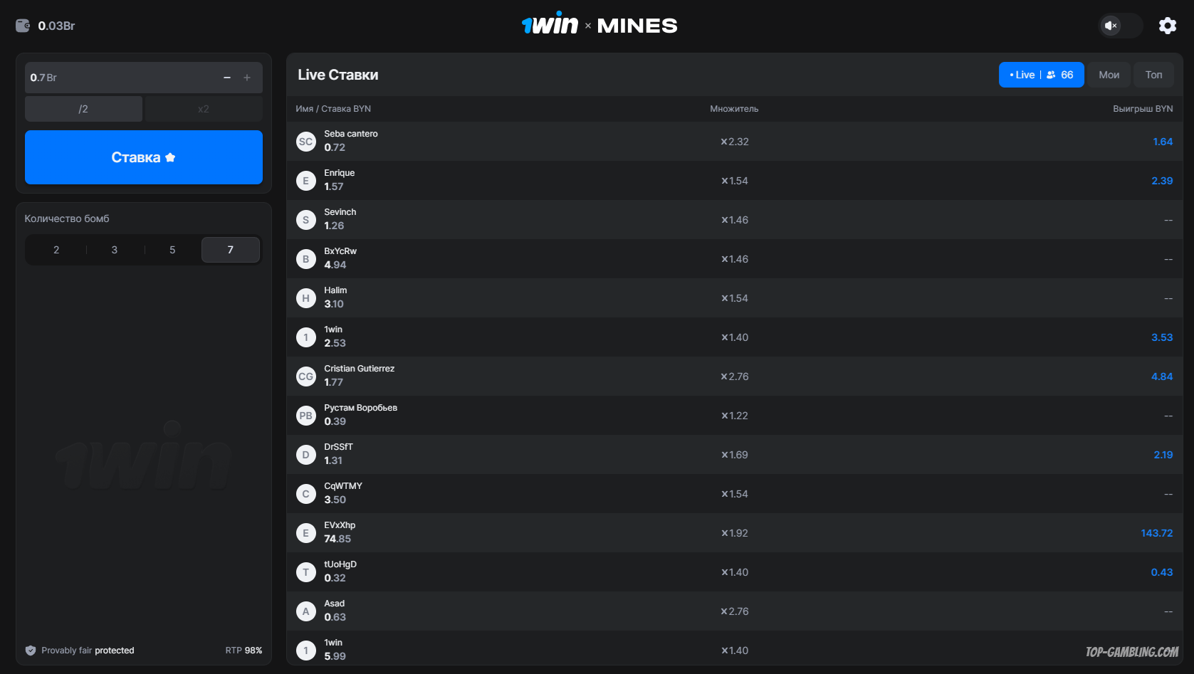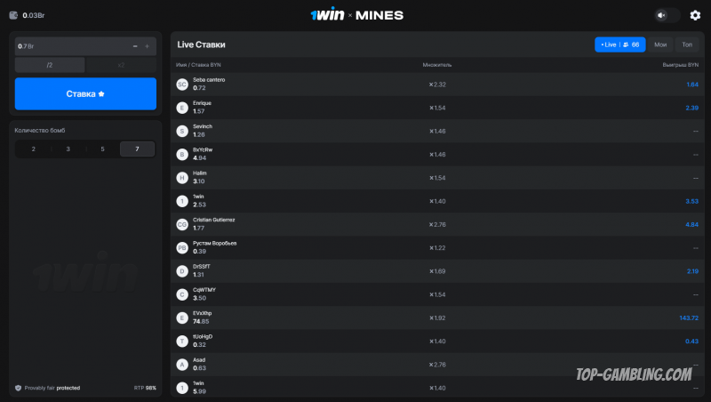 Вся информация — текущая ставка, коэффициенты, выигрыш и количество оставшихся мин — находится под рукой и обновляется в реальном времени.