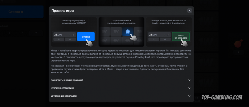 Никаких бонусов или джекпотов. В отличие от многих слотов, Mines не предлагает дополнительных возможностей увеличения выигрыша.