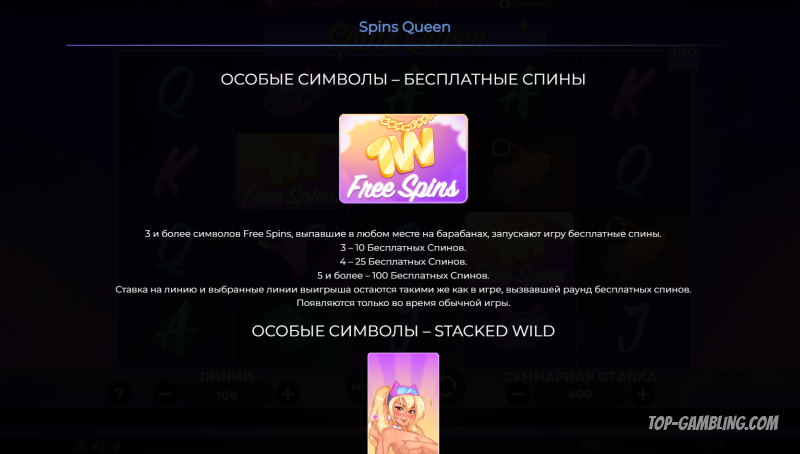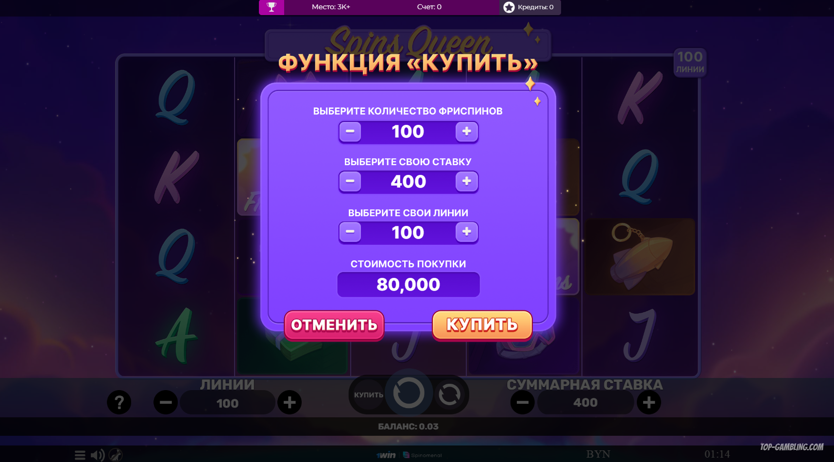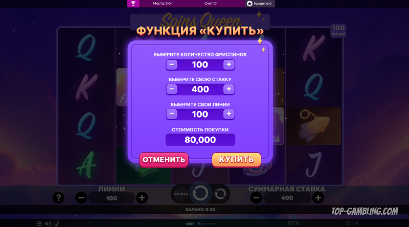 Особенностью Spins Queen является возможность покупки бонуса. Игрок может самостоятельно выбрать количество фриспинов, ставку и число линий, после чего система рассчитывает стоимость покупки.