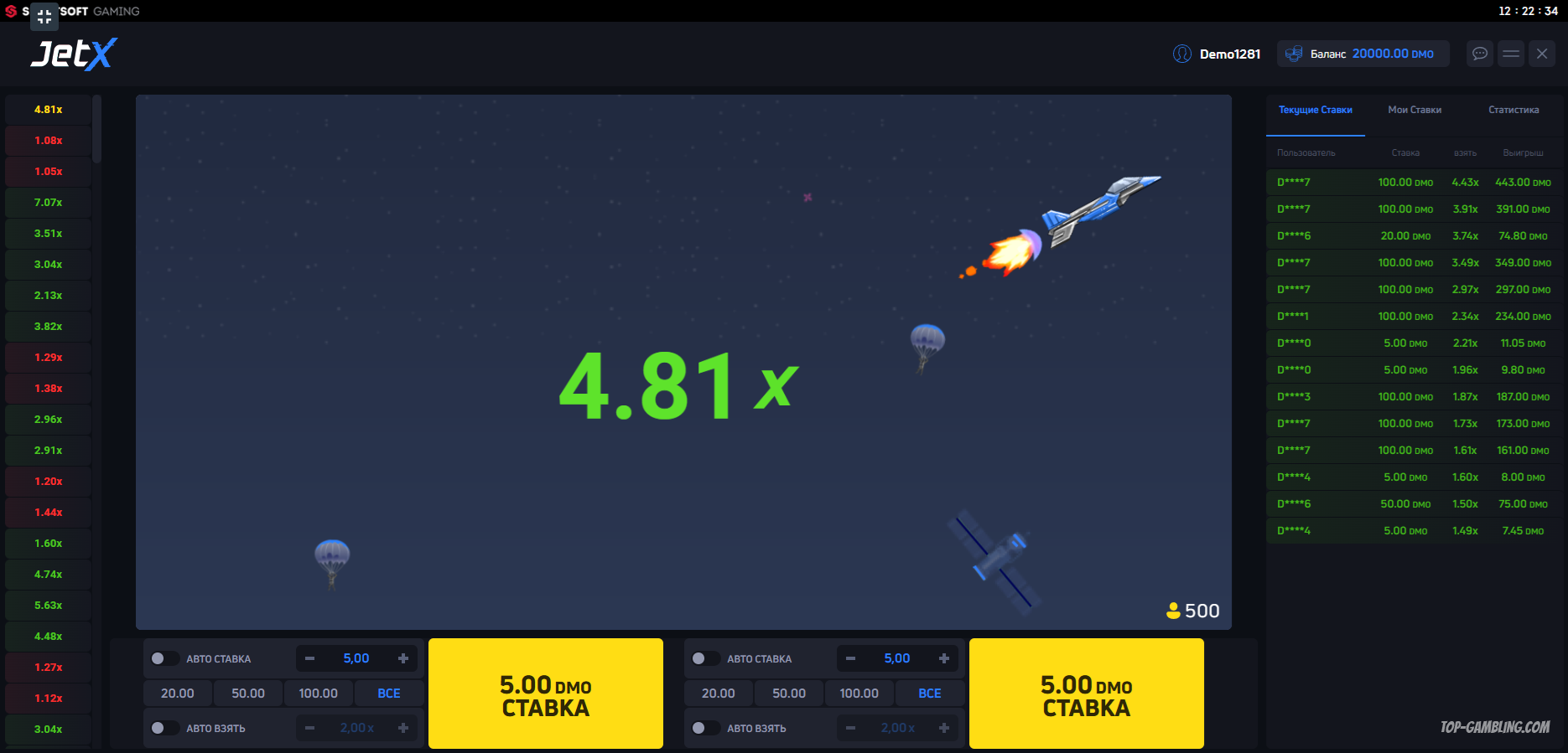 В отличие от классических слотов, Jet X не использует барабаны, символы или линии выплат. Здесь главный элемент — коэффициент (x), который начинается с 1.00 и плавно увеличивается.