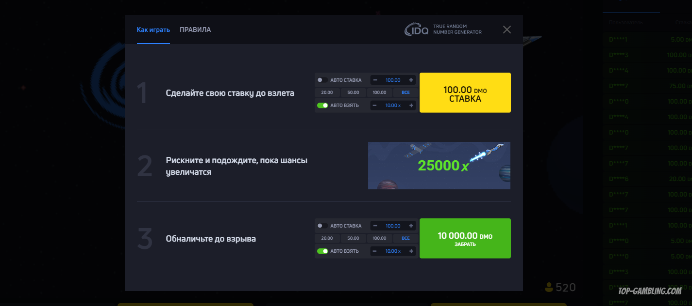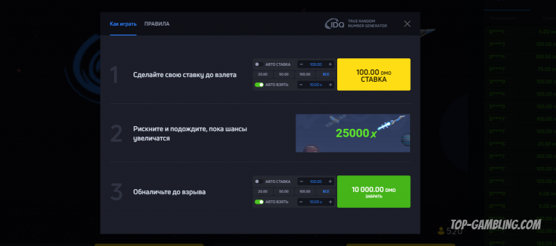Игра может закончиться уже на x1.02 или дойти до x100 и выше — всё зависит от внутреннего алгоритма, который формирует результаты случайным образом.