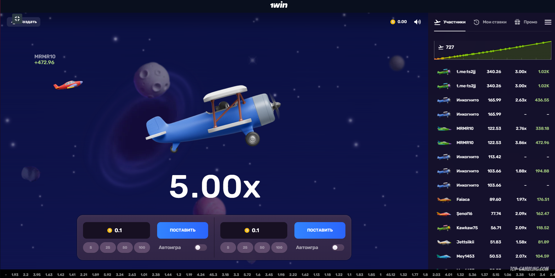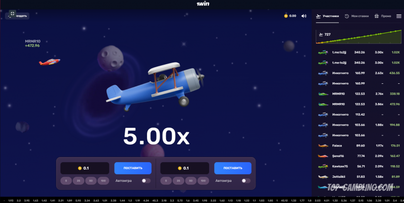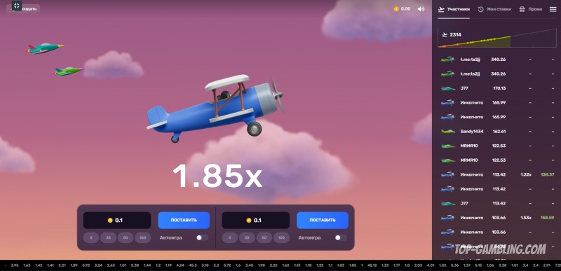 Суть механики проста: игрок указывает сумму ставки и нажимает «Старт». Самолёт начинает движение по экрану, при этом коэффициент начинает расти от 1.00x.