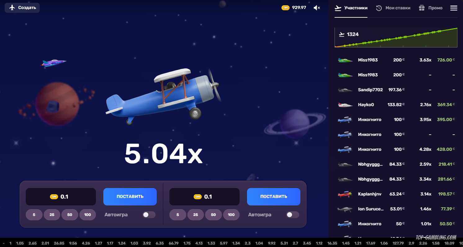 Чем дольше самолёт летит, тем выше множитель выигрыша. Но если не вывести ставку до того, как он «улетит» — ставка сгорает, и деньги теряются.