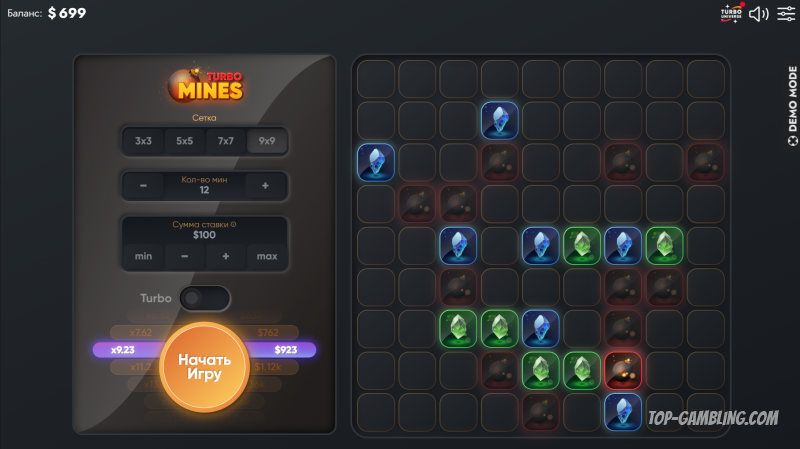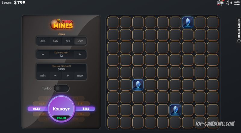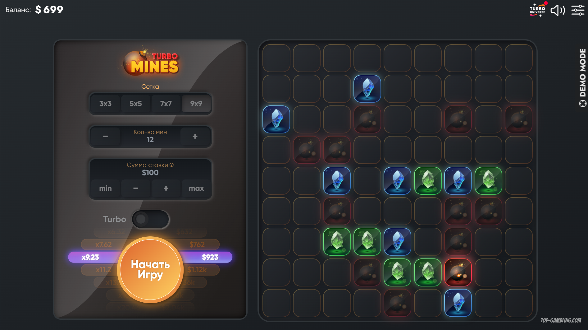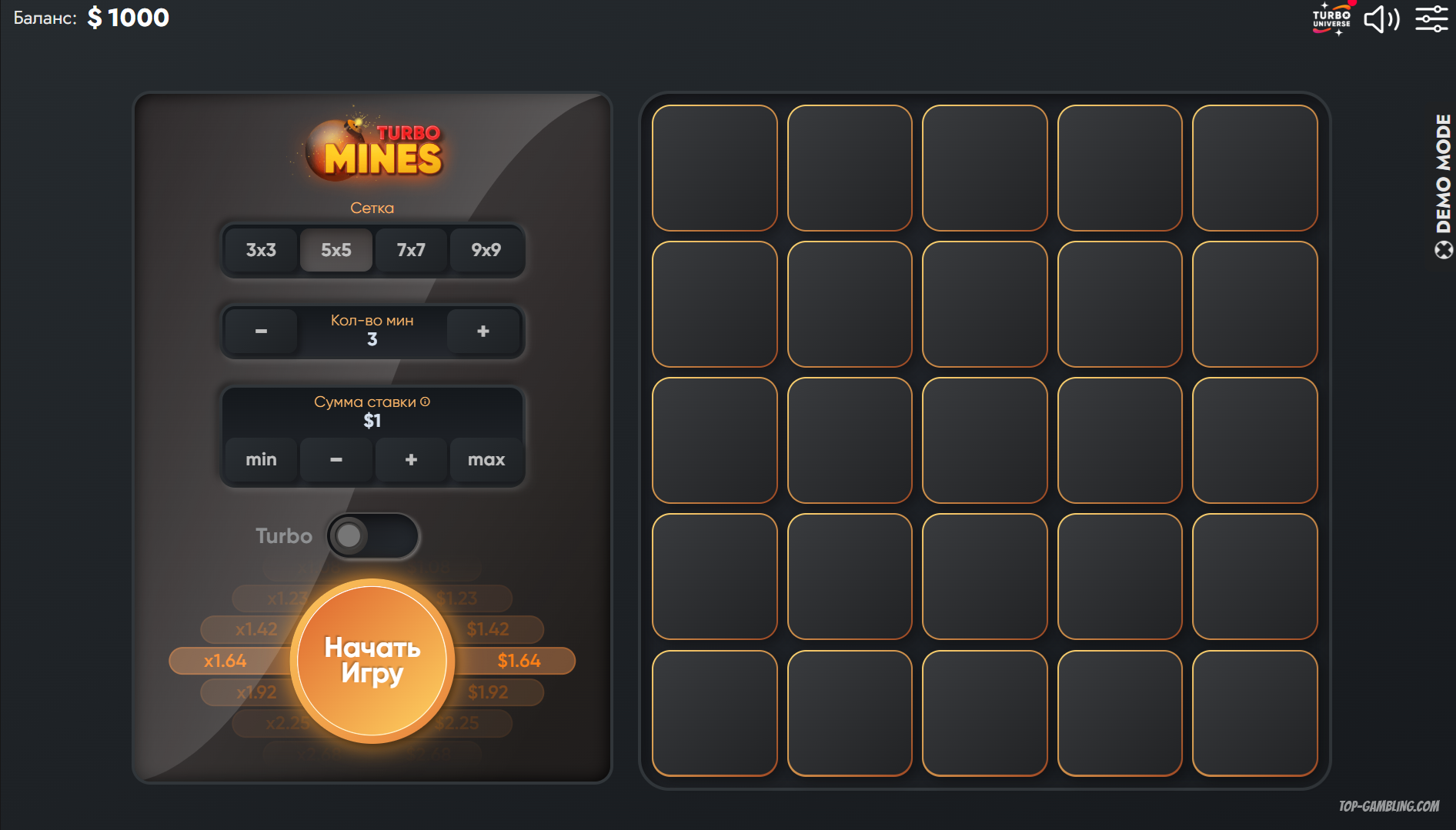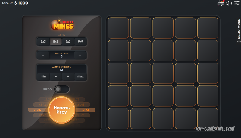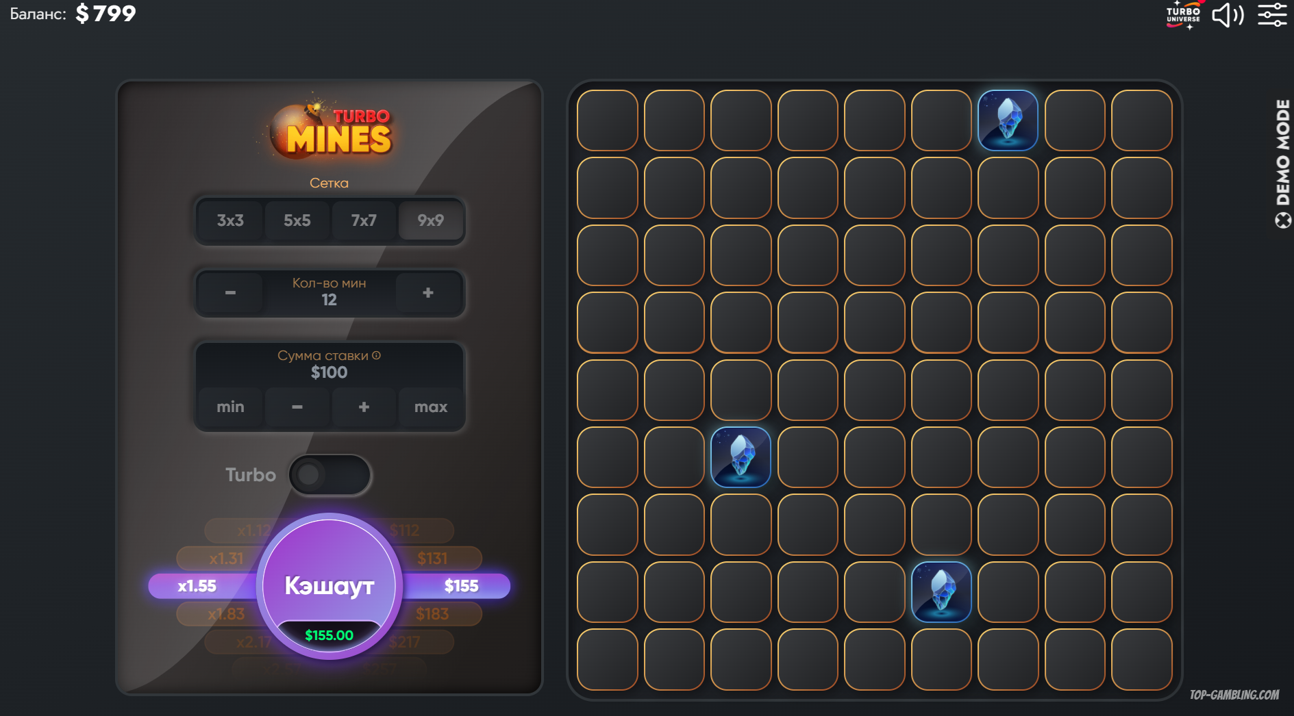 Здесь игроку нужно открывать ячейки на поле, избегая мин, чтобы накапливать выигрыши с каждым удачным ходом. Главное отличие в том, что раунды в турбо-режиме проходят почти мгновенно, без лишних анимаций и задержек, что позволяет за короткое время совершать десятки ставок.