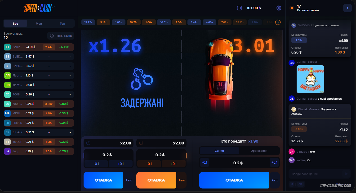 Speed n Cash — это краш-игра, где всё решают скорость и рефлекс. Здесь ставка растёт по мгновенно увеличивающемуся коэффициенту, и задача игрока — успеть её забрать до того, как "скорость сгорит". В отличие от классических слотов, игра максимально проста по механике, но не уступает им в азарте и возможностях.