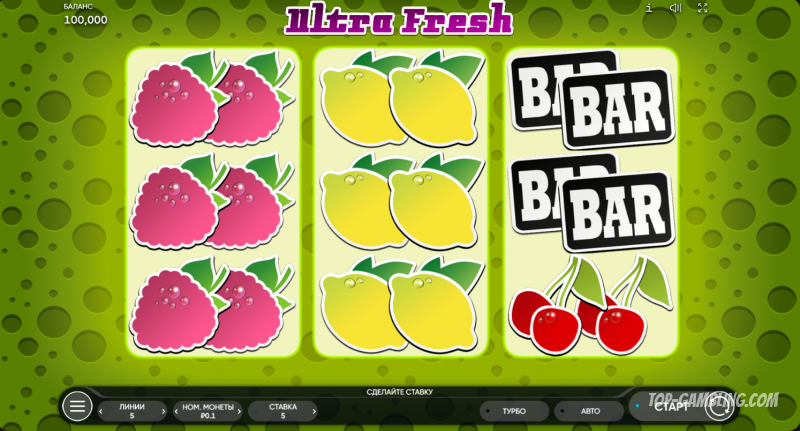 Ultra Fresh — классический фруктовый слот с яркой и аппетитной визуализацией, который привлекает своей простотой и динамичностью. В игре пять барабанов и три ряда, а выигрышные комбинации формируются по 10 фиксированным линиям. Основные символы — сочные фрукты: апельсины, лимоны, ягоды и арбузы, а также золотой колокольчик и семёрка.