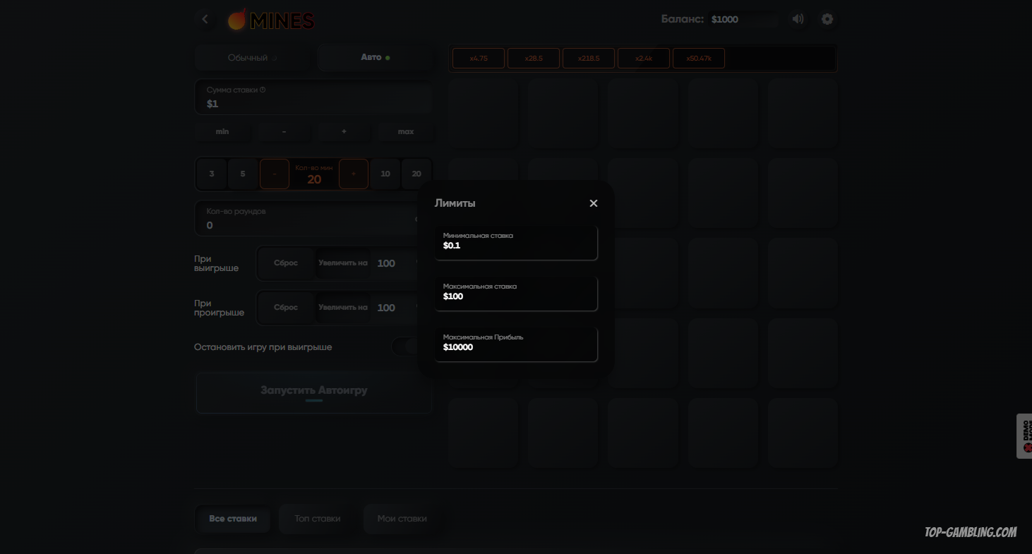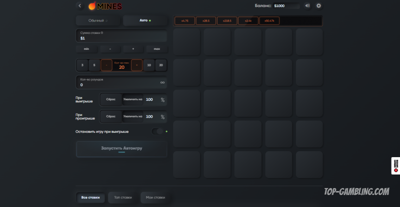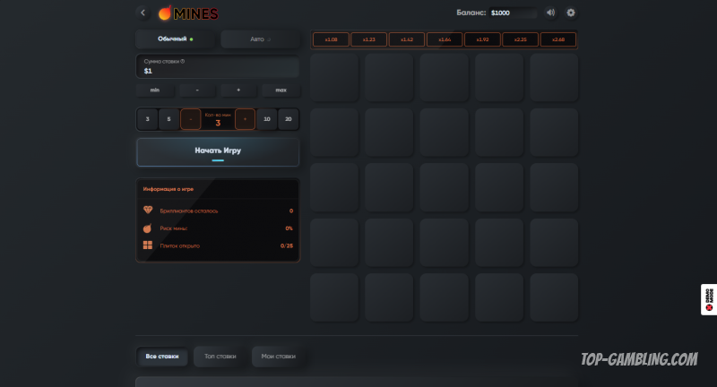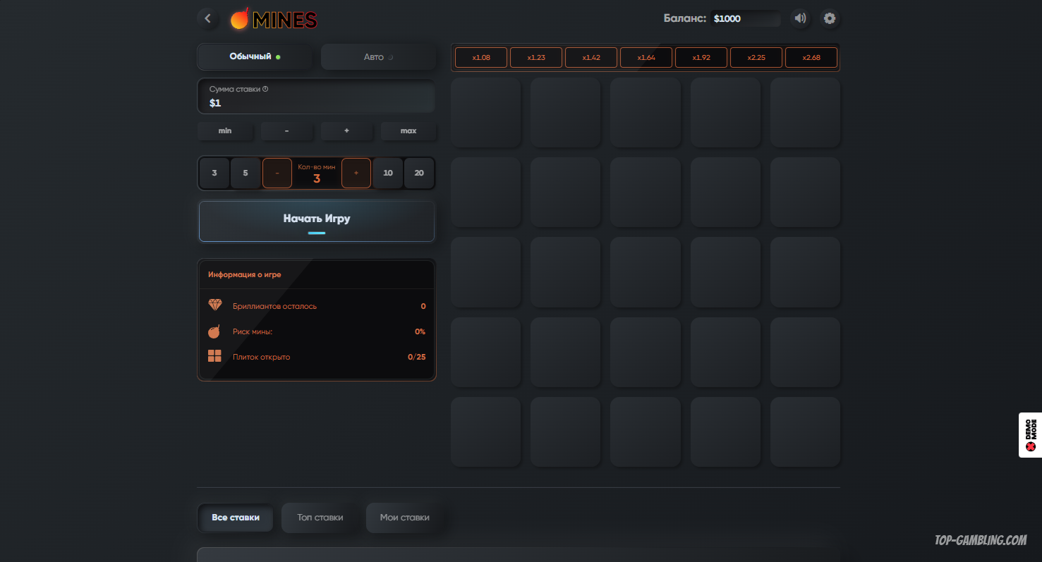 - 1–3 мины: минимальный риск, низкие множители, хорошая стратегия для медленного разгона и обучения.