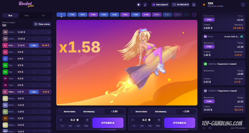 - Хотя ставка делается до старта, вы можете варьировать ритм, наблюдая за поведением ракеты в предыдущих раундах. Например: