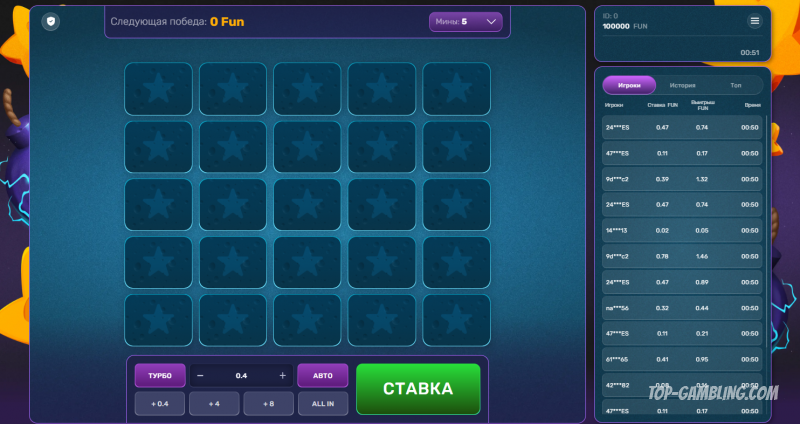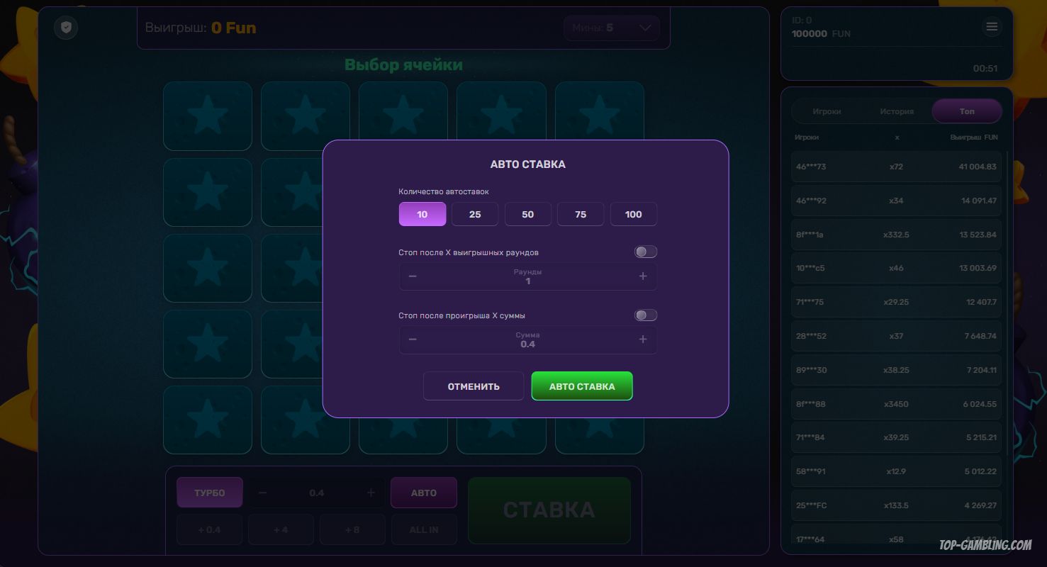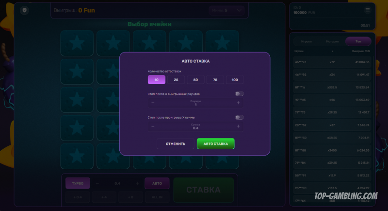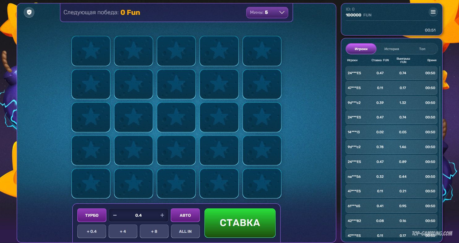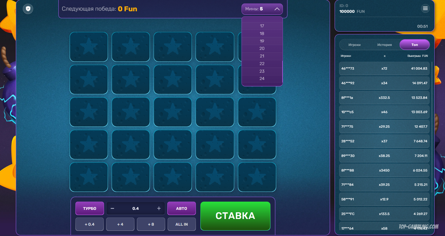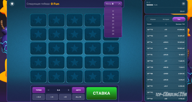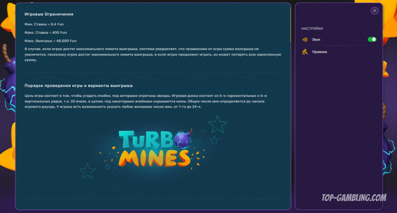В Турбо Минес результат напрямую зависит от количества мин на поле. Чем больше мин, тем выше потенциальный множитель — но и шанс «взорваться» возрастает. Поэтому важно подобрать такой уровень риска, который подходит именно вам.