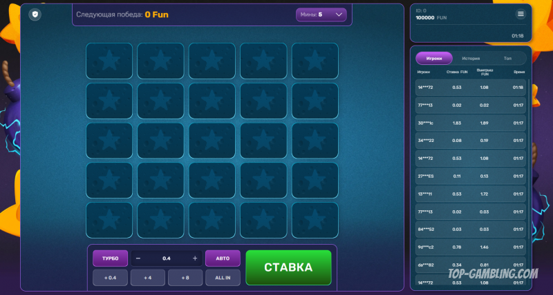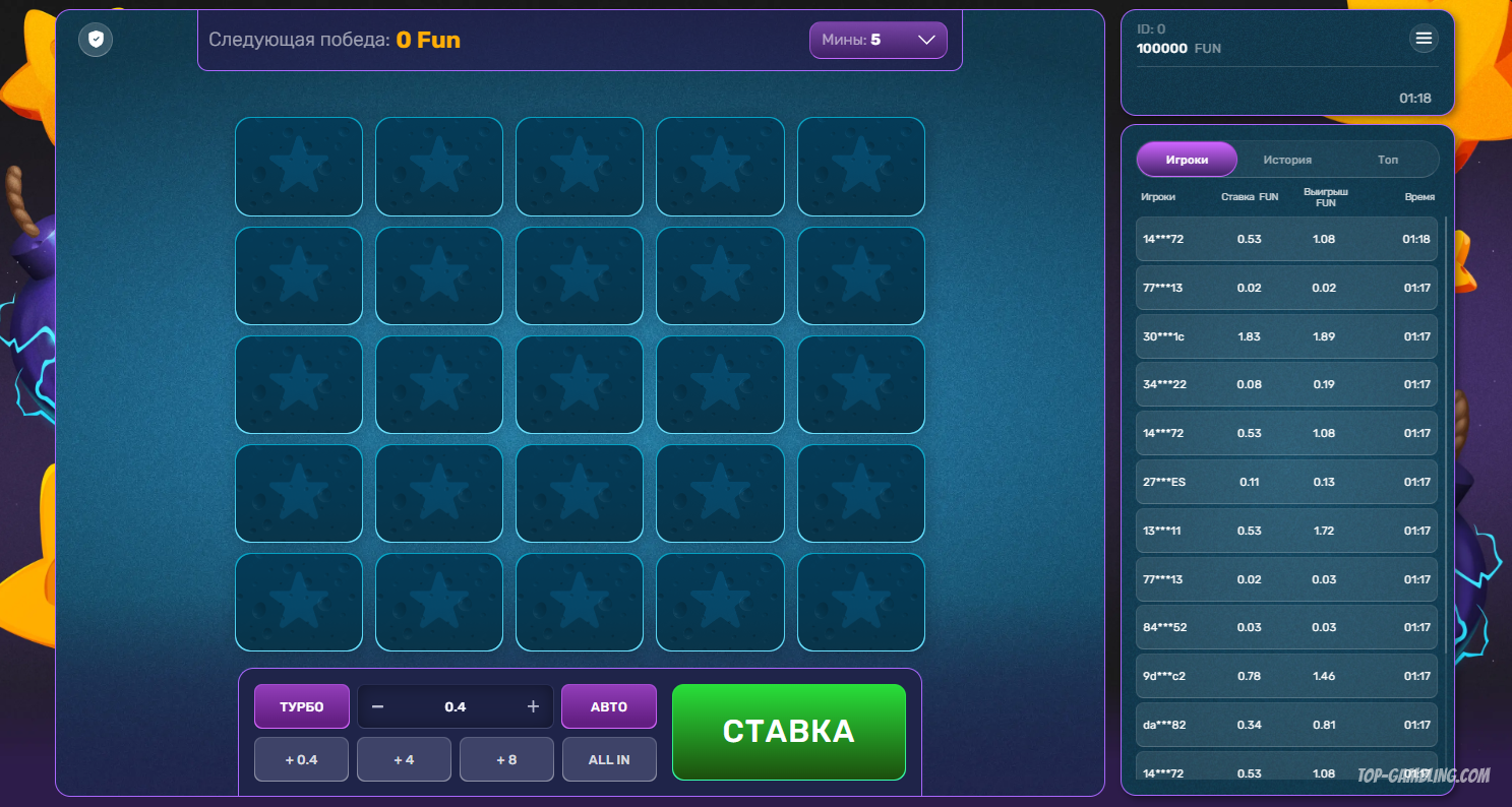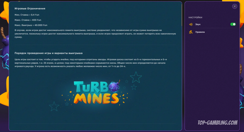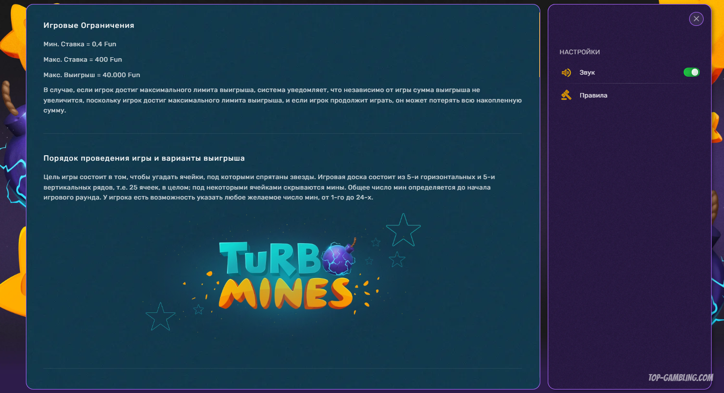 Turbo Mines — это динамичная игра на поле с ячейками, под которыми могут скрываться либо пустые клетки (приносящие выигрыш), либо мины (приводящие к проигрышу).