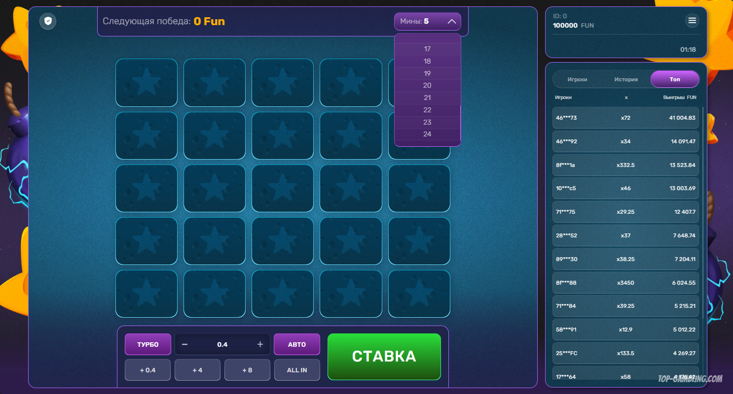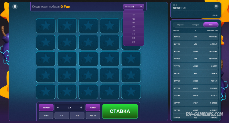 Выбор количества мин — ключевой шаг, определяющий баланс между риском и потенциальной прибылью. В Turbo Mines можно установить от 1 до 24 мин на поле, и от этого зависит, насколько опасной и прибыльной будет каждая попытка открыть клетку.