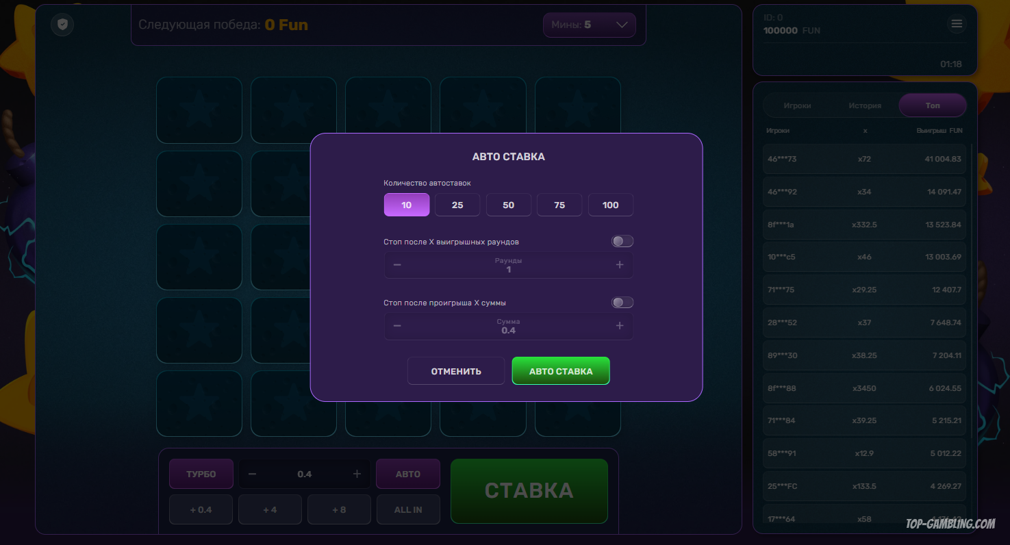 - Выбор числа мин: от него зависит вероятность выигрыша и множители