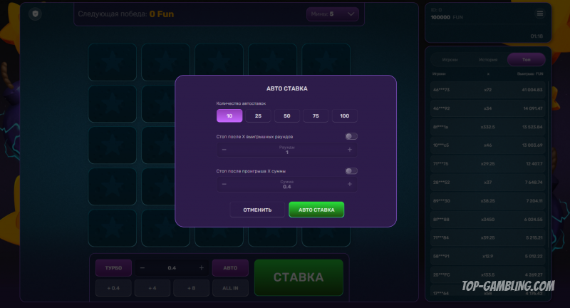 - Автостопы: заранее установи лимит по выигрышу и проигрышу, при достижении — остановка сессии