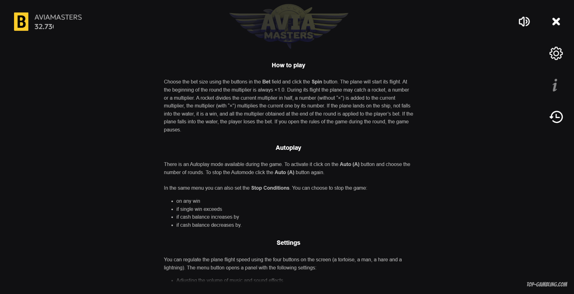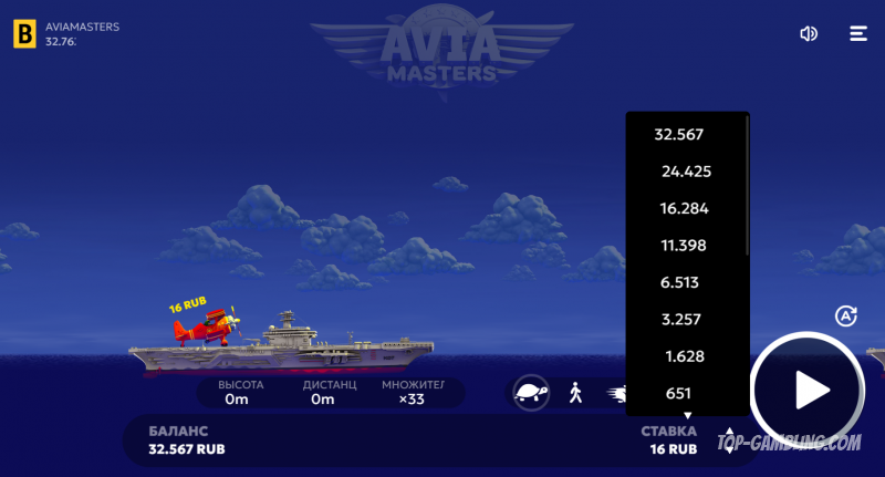 Раунд начинается с того, что игрок выбирает сумму ставки. После запуска самолёт взлетает, а на экране отображается увеличивающийся множитель.